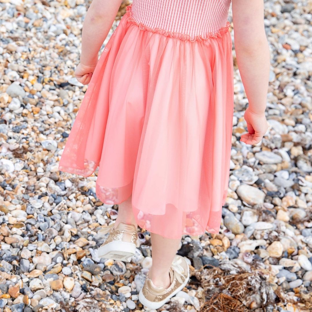 FREE UK DELIVERY & RETURNS With design elements taken from our best selling styles, Holly will become a summer favourite. Stretch bodice in seersucker stripes achieve the perfect balance of comfort and cool and make it easy to pull on. The cap sleeves and ballet neckline are joined by a delicate mesh skirt with ruffle at the waist. Matching mesh trim at the neck and arms finish the fun details of this super SUMMER TWIRLER! Also available in Blue. Click to view Holly Blue. Designed for magical everyday wear with machine washable and breathable cotton rich fabrics. Bodice: 44% Nylon, 25% Cotton, 25% Polyester, 6% Lyocell, Skirt: 46% Polymide, 38% Cotton, 16% Elastane FEATURES