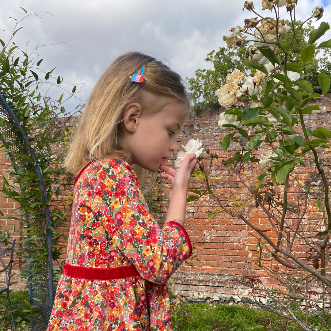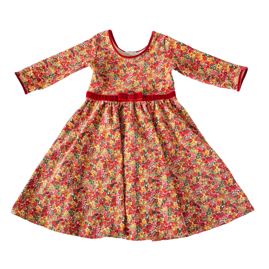 Posy is a pull-on 3/4 length sleeve girl's red flower dress made from stretch petite corduroy with velvet trim...soft and plush to the touch.  With it's stunning flower detailing, Posy is the perfect choice for that dress to take her back to school and through the holidays! With 3/4 sleeves this is an all season favourite.  Complete the outfit with the Charlotte Gold coat - click to view Charlotte.